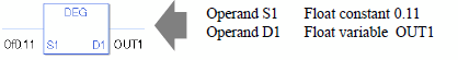 The DEG/DEGP instructions convert values to degrees. The unit of angular measure, radian, is converted to degrees and stored in D1.