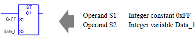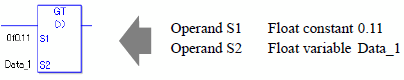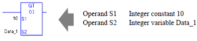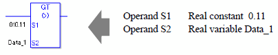 The GT instruction is a compare instruction. The GT instruction compares S1 with S2. If the result of the comparison is S1 > S2, the instruction passes power. Be careful when comparing real values. For example, if the operand value is 2.000000000001, it is still greater than 2. When using the GT instruction, an error will occur if the variables specified in operands S1 and S2 are not the same type. Designate the same variable type in all operands S1 and S2.