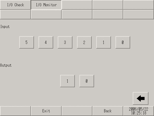 The input/output bit display screen opens. [Input] shows the current ON/OFF status. [Output] Touch this to toggle the status between ON and OFF. If the device connected to the DIO board performs properly, check the settings of the project file on GP-Pro EX. If the connected device does not operate normally, check the wiring between the display unit and the connected device, and then check the following items.