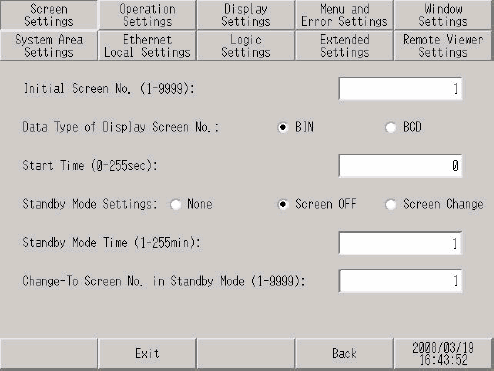 The [Screen Settings] screen opens. Set [Data Type of Display Screen No] to either [BIN] or [BCD].