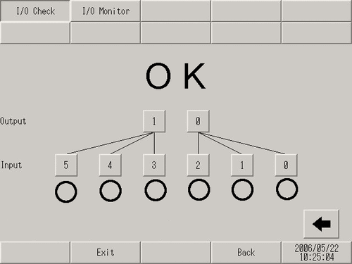 Connect the loopback cable to the DIO board, send data from the two output terminals to the six input terminals, and compare the input and output data. When the data matches with the expected value, the operation is judged as correct and [OK] is displayed on the screen. When the data does not match with the expected value, [NG] is displayed.