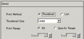 For [Thumbnail] in [Print Method], select the Print Range from [All] or [Specify Range]. For [Specify Range], specify the Range with mark numbers in [Start] and [End].