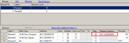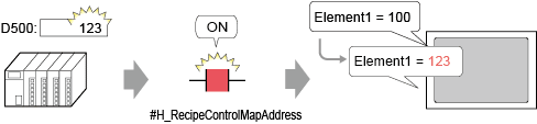 Change the mapped address value (D500), and reflect it in Element1 of RecipeA.