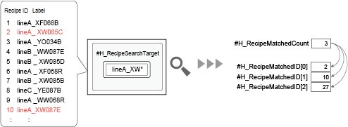 When you search for an enhanced recipe label, the number of recipes matching your search condition and their corresponding IDs are stored in system variables. This gives you more flexibility in creating screens, as you can search without using dedicated enhanced recipe parts.
