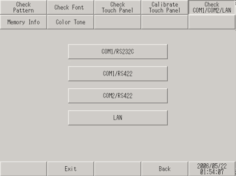 When the [Maintenance Menu] screen opens, touch [Check COM1/COM2/LAN].