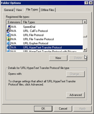 When the following [Folder Options] dialog box appears, select [URL:HyperText Transfer Protocol] from [File Types] and click [Advanced].