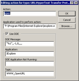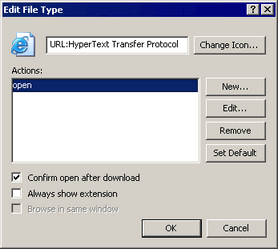 Click [New] in [Edit File Type], set open in [Actions], and then set the path of the browser in [Application used to perform action].
