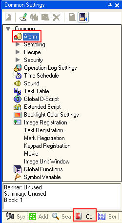 在工作区的[Common Settings]窗口中选择[Alarm]。 |