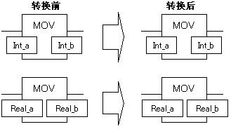 GP-Pro EX不允许在一条指令上指定不同类型的变量。如果在MOV指令上指定了不同类型的变量,转换时会添加一条用于匹配变量类型的指令。